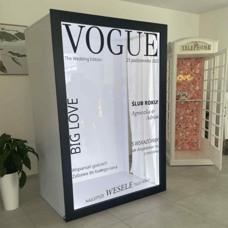 Fotobox Magazine to stylowa atrakcja eventowa, która łączy luksusowy wygląd z doskonałą zabawą. Elegancka forma okładki magazynu przyciąga uwagę i zamienia gości w gwiazdy okładki.